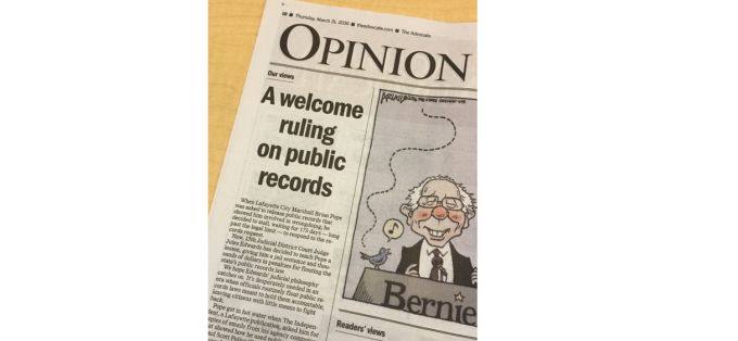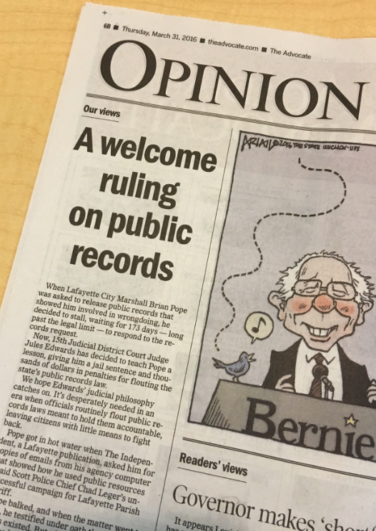 It now appears that last week’s ruling by 15th Judicial District Judge Jules Edwards in the ongoing public records battle between The Independent and Lafayette City Marshal Brian Pope is reverberating across the state.