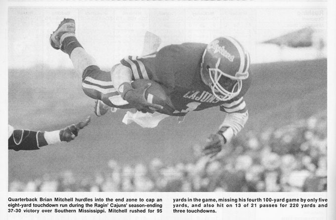 By the time he completed his collegiate career, Mitchell held a number of NCAA records: only QB in Division 1 (now FBS) history with more than 3,000 yards rushing and 5,000 yards passing; most career rushing touchdowns (47) by a quarterback. He was twice voted Louisiana Player of the Year by the state’s sports writers — a superlative considering the highly recruited and much more heavily publicized players down the road in Baton Rouge.