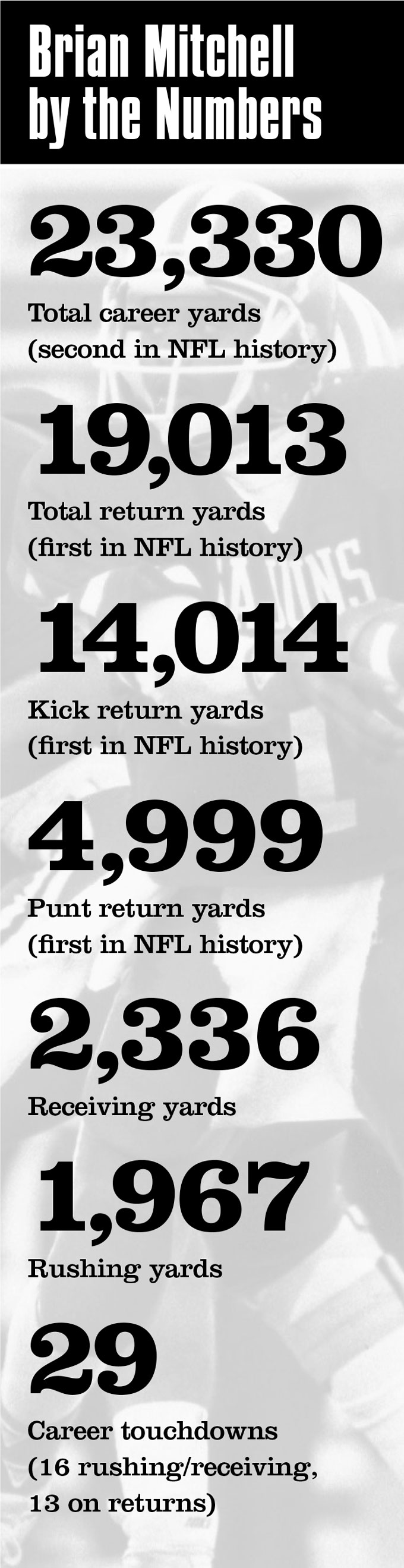 Twenty-three thousand, three hundred and thirty. It’s long when you write it out — 13.25 miles when you run it through a yards-to-miles converter — and it’s second in total yards in NFL history. Brian Mitchell matriculated a football — to riff on a famous sideline exclamation of a Hall of Fame coach (Hank Stram) now in repose in a mausoleum down the road in Covington — up and down a gridiron farther than anyone who’s ever played in the National Football League except one: Jerry Rice — you’ve heard of him.