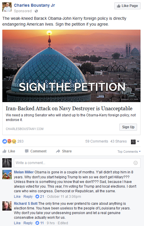 For proof, check out virtually any of Boustany posts on Facebook. It can be about early voting, Obamacare, Houthi rebels firing missiles at a Navy warship — anything in the news or among the issues that would otherwise serve to reaffirm his conservative Republican bona fides. But the Trumpsters are having none of it.