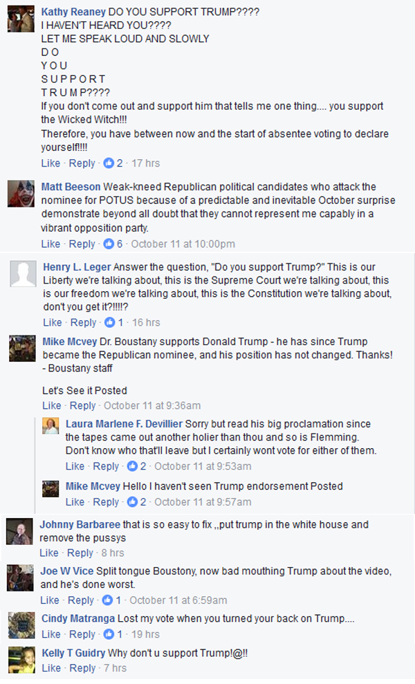 For illustration, below we’ve reproduced a sample of a few posts Boustany made to Facebook this week, post-“grab her by the p***y.” Through the magic of Photoshop we’ve filtered out most of the non-Trumpster comments.