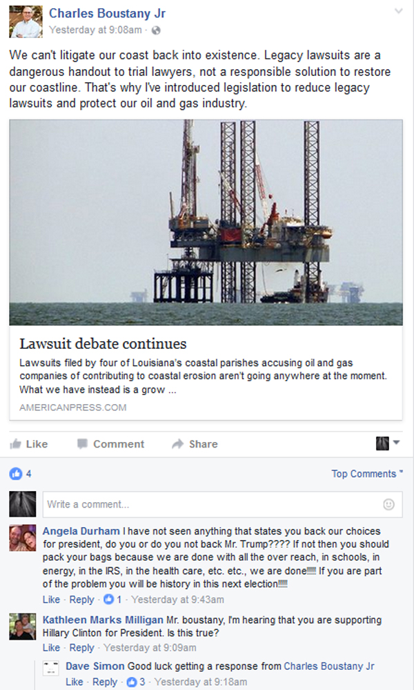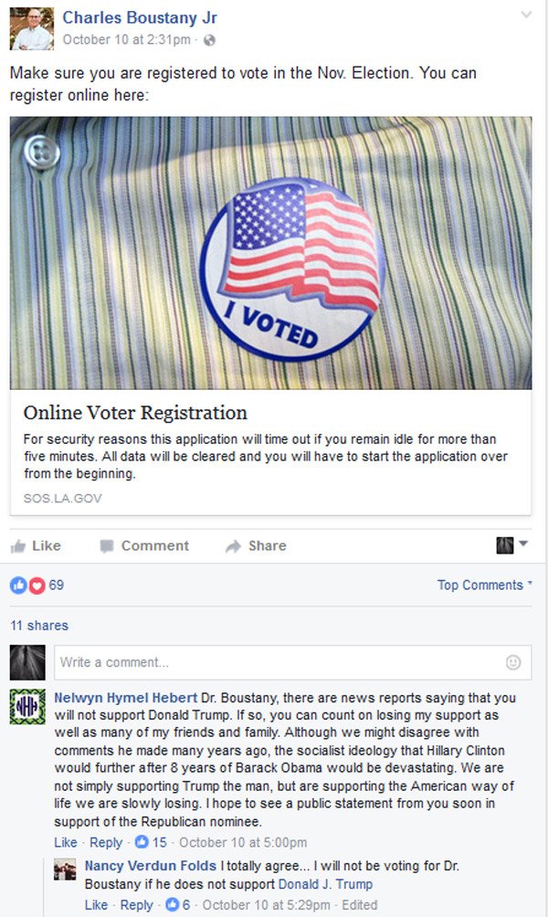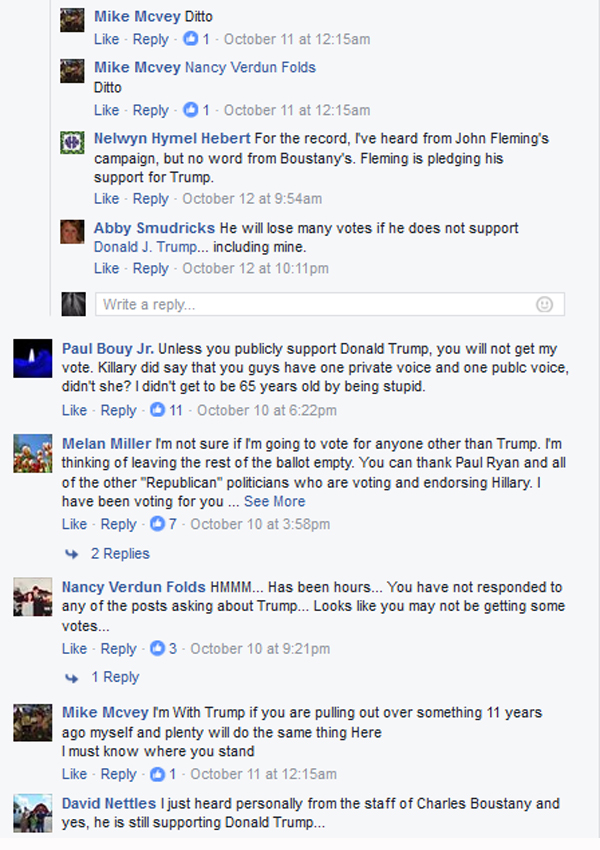 Now, post-“grab her by the p***y,” Tea Party candidates like John Fleming in North Louisiana have had no qualms sticking by Trump. Boustany, on the other hand, has a trickier path to tread. He doesn’t want to alienate moderate GOP and independent voters, especially suburban Republican women who are turned off by Trump, but he doesn’t want to risk the ire of the hardcore Trumpsters, who have taken their champion’s words to heart: Silence, or even wavering support, is tantamount to deleting Hillary Clinton’s 30-bazillion Benghazi emails yourself and murdering Vince Foster.