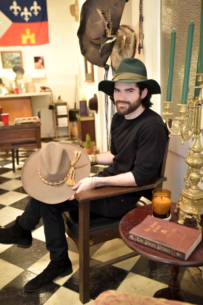 He opened shop in July after working in film via acting and costuming. His love of style and love of hats led him down a long path to discovering exactly how one makes a hat by hand. He has since crafted around 100 pieces for individuals and now has a line of hats at Partners’ Ltd. on Kaliste Saloom Road in Lafayette as well. His work runs the gamut from cowboy to fedora, and he uses rabbit and beaver or mink most often. His rabbit pieces start at $300 and beaver hats at $600. He also strives to infuse his Cajun roots into all that is Colby Hebert Chapeaux.