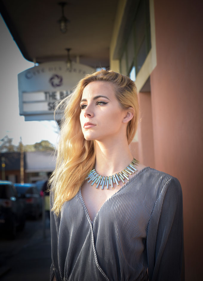 Alexa in accordion pleat dress from Brother's on the Blvd.