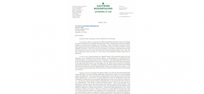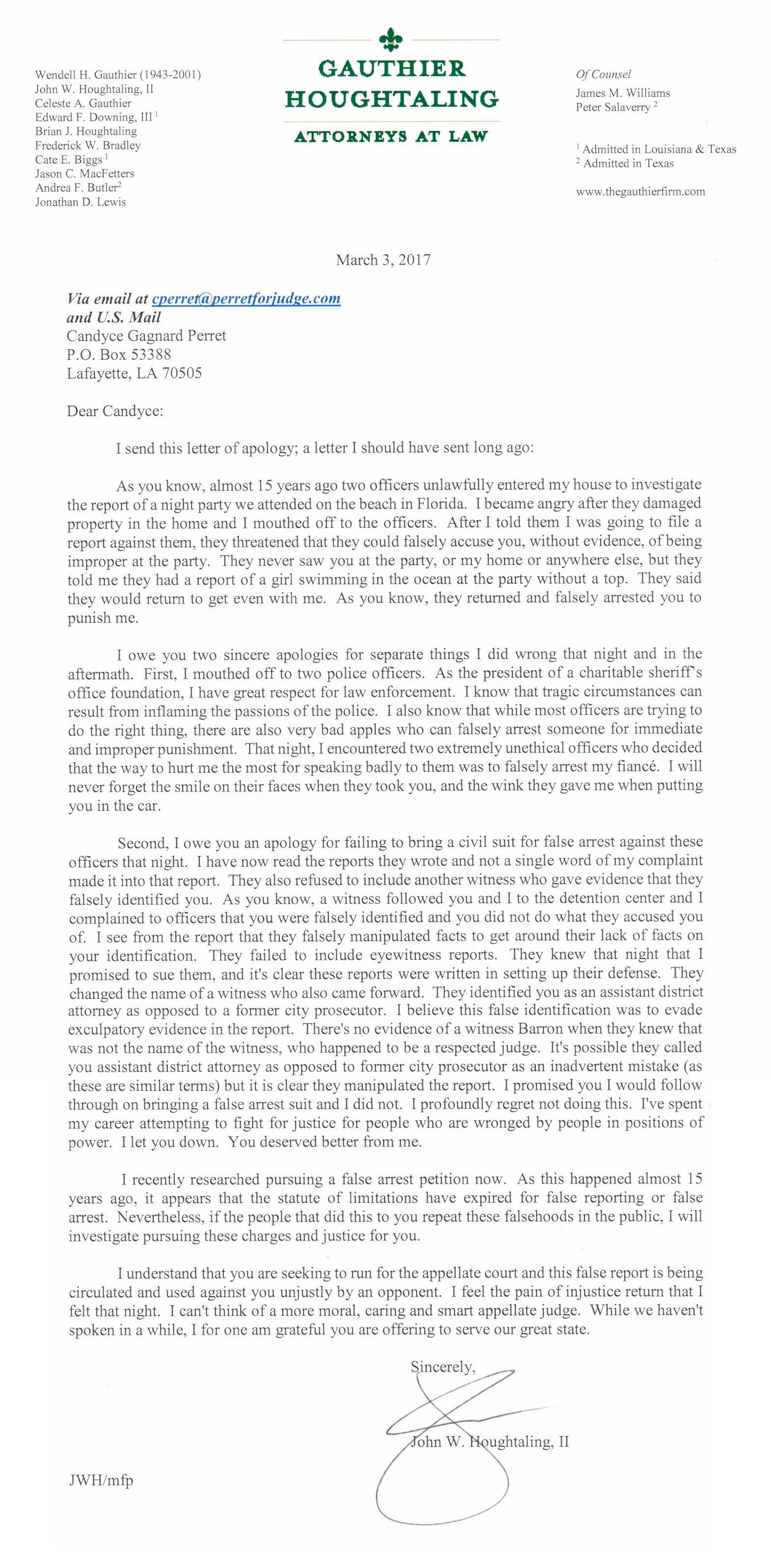 Her fiancé at the time of her arrest, New Orleans attorney John W. Houghtaling II, who was interviewed for the story, sent the paper the following letter just as the story was being posted online. In the letter, which comes nearly 13 years after Gagnard Perret's arrest, he apologizes to her for not filing a lawsuit alleging false arrest, saying he was unaware of the statute of limitations.
