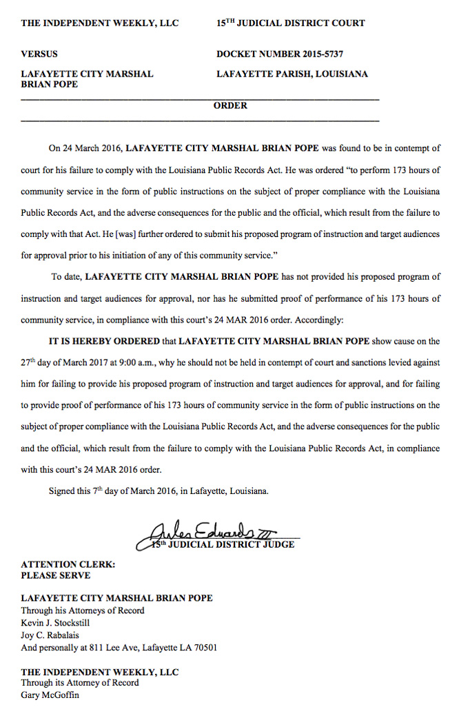 In March of last year, Judge Edwards ordered Pope to perform 173 hours of community service after finding him in contempt of court for failing to comply with the Louisiana Public Records Act. That community service was to be “in the form of public instructions on the subject of proper compliance” with the public records law. As Tuesday’s court order (reproduced below) indicates, the marshal has so far failed to submit a plan for performing the community service or proof that he’s performed any of it.