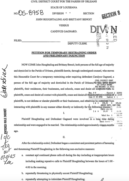 It was filed on behalf of Houghtaling and his then-girlfriend, Brittany Benoit, against Gagnard on July 1, 2005, by Stephen Huber, an attorney in Gauthier, Houghtaling, Williams, & Sculzer, the firm that Houghtaling has headed since 2001.
