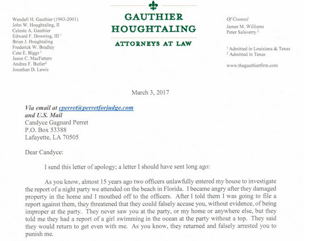 I understand that you are seeking to run for the appellate court and this false [arrest] report is being circulated and used against you unjustly by an opponent. I feel the pain of injustice return that I felt that night. I can’t think of a more moral, caring and smart appellate judge. While we haven’t spoken in a while, I for one am grateful you are offering to serve our great state.This is the third major revelation affecting the Perret campaign that has cast doubt on what once appeared to be her inevitable election based on the array of political and business support her campaign attracted. The IND’s reporting on a federal investigation into her husband’s company, Louisiana Specialty Institute, and a subsequent report about Gagnard Perret’s Florida arrest coupled with he falsely identifying herself as an ADA has resulted in Perret avoiding forums with her opponents Vanessa Anseman and Susan Theall, each of whom are now dealing with problems of their own. (Read more about Anseman here and Theall here.)
