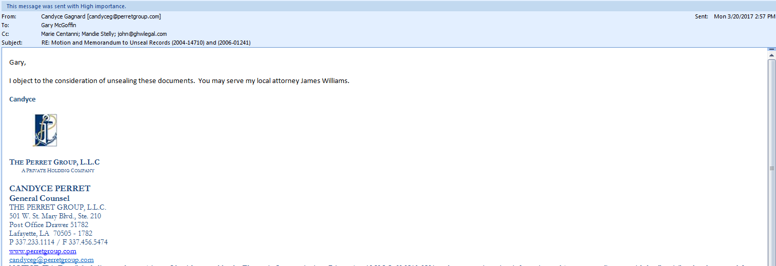 Gagnard Perret also notified the paper the she will fight the motions. “I object to the consideration of unsealing these documents,” she wrote in a 3 p.m. email (marked with high importance) to McGoffin from her Perret Group email address. “You may serve my local attorney James Williams.”