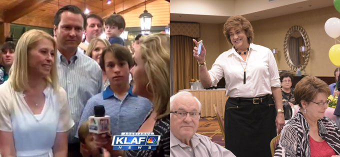 Candyce Gagnard Perret and Susan Theall, pictured here from their Saturday victory parties, will face off in the April 29 runoff.