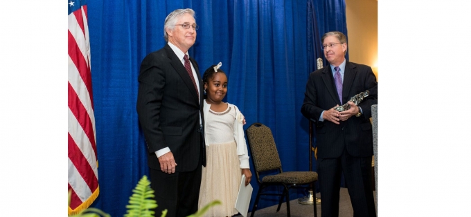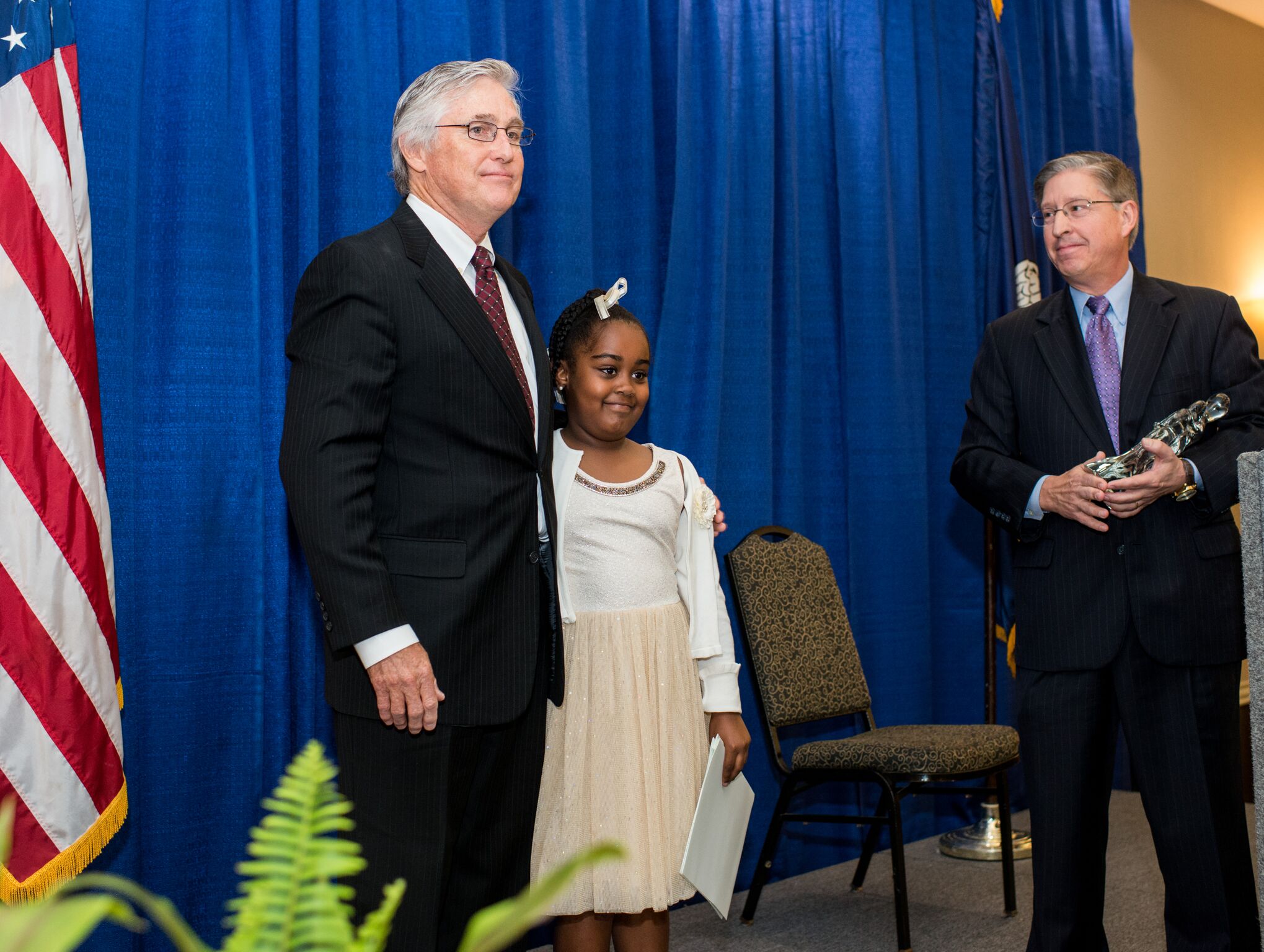 Dr. Kip Schumacher hugs Zhoriél Tapo, a Plantation Elementary student enrolled in The Leader in Me program, as UWA board member Rob Eddy looks on.