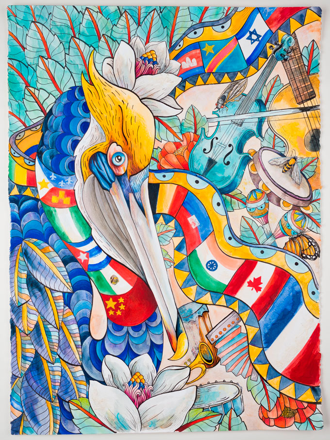 Festival International de Louisiane is proud to announce Cayla Zeek as the Official 2017 Visual Artist. Zeek has created a piece that captures the spirit and joy of the nation’s largest, community held international music festival. Drawn out from the bird is an offering of diverse flags from the many nations tied to this francophone festival and local community. The playfulness in the figures of this piece encompass the whimsical spirit of music, art, and people - the core ingredients that give Festival International de Louisiane its unique flavor. “My eagerness to attend Festival International is something I have felt annually since I went to my first one as a young gal,” notes Zeek. “I wanted L’ ami à plumes de la Fête to represent that feeling of anticipation for this exceptional event.”