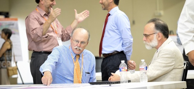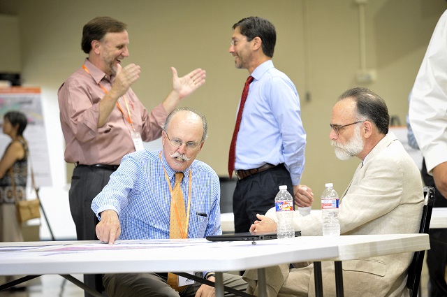 State consultants Steve Wallace, standing left, and Jeff Grob, seated left, talk Connector modification at a public open house.
