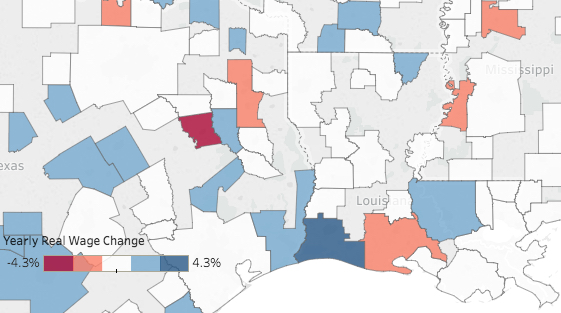 By contrast, the report shows that Lafayette wages have declined in that same time frame by 1.8 percent, due in large part to stagnation in the price of oil since a cataclysmic crash in 2014.