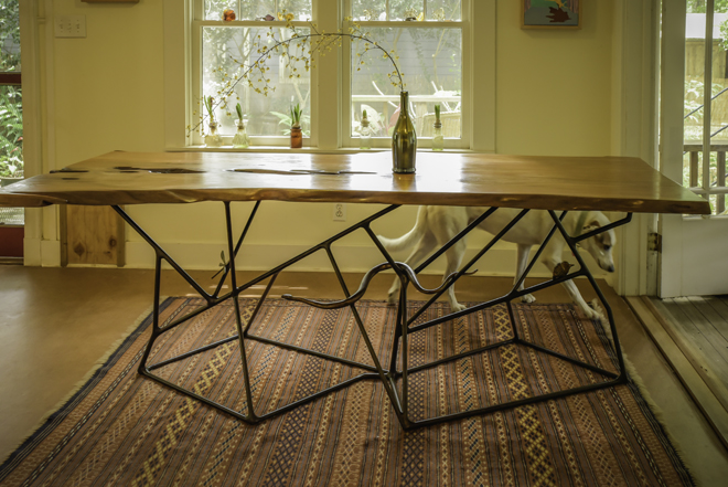 When the table returned, several months later, I was literally struck stupid by Ralph’s vision. He had executed the lines of leafless branches with the same remarkable abstractions that nature does so effortlessly. Irregular steel trapezoids support the table. A coy serpent twines his length through the bars. A dragonfly lights; a small bird huddles for warmth. The cypress slab, sanded and waxed by Ralph, floats above the metal structure as if it had been growing there, all along, in my kitchen.