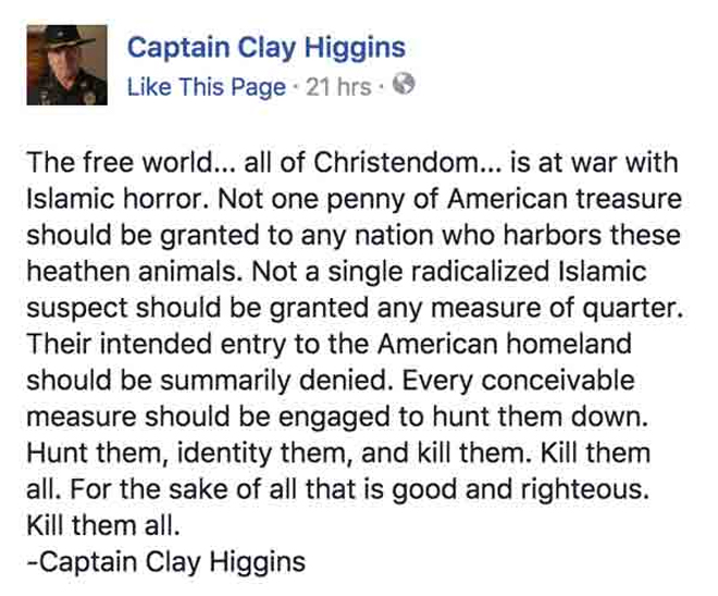 Red meat for his ravenous supporters, to be sure — and a fair sample of them weigh in with attaboys for Higgins’ holy-war huffing. But the congressman's meat-headed myopia drew a ton of criticism and condemnation in the comment thread beneath his Sunday post, too. Not a few of the responses point out the recent $110 billion arms deal between the U.S. and Saudi Arabia, one of the most repressive Islamic states on the plant and home country to most of the 911 terrorists.