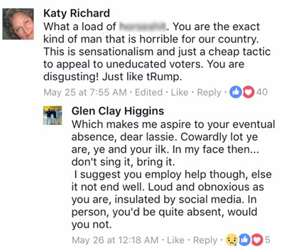 Higgins has a reputation for a fiery tongue, one that he’s brandished liberally in public, typically while embracing his sometimes controversial Captain Clay persona. His reply to Richard is not the first time he’s verbally abused a commenter on Facebook. During his campaign for office last year, he belittled a woman in a thread about the Orlando massacre, in which dozens were murdered in a mass shooting at a gay nightclub, and appealed to a need for “superior violence” in the fight against terror. “Panzer tanks will not be stopped by flowers,” he replied to the woman, who criticized his call to righteous violence. He then told her to “shut the f**k up.”