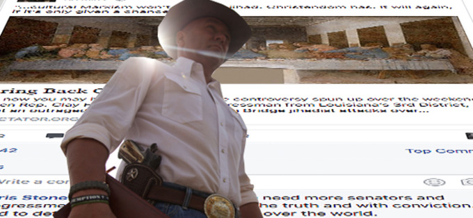 I was slightly alarmed at first. I asked him if that was a threat, to which I got no reply. And to threaten a constituent on Facebook is just cowardly. His extreme religious views have no place in our secular, democratic government. I think he should focus on getting help for his district, which includes some of the poorest, most illiterate and at-risk Americans in the entire nation. He should stop with his fear-mongering videos and hate-filled rhetoric about things that really aren’t the problems facing his constituents in Louisiana. I’d say, take off the costumes, put down the guns and start doing some real work to help us move forward in Louisiana.