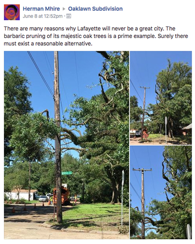 Facebook raged right along: “How ridiculous to permit this kind of pruning,” one commenter remarked. “Deplorable! Shocking!” Mhire replied. And so it went, with others posting images from Souvenir Heights and other woody, old-Lafayette neighborhoods where Asplundh, the company contracted with Lafayette Utilities System for annual tree trimming — a necessity to prevent extended blackouts caused by limbs falling onto power lines during hurricanes and other severe weather events — has made a pass.